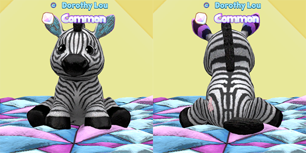 Another cute new pet! Dorothy Lou sparked this adorable baby Zebra, featuring some beautifully blue shiny inner ears and fun rainbow outer ears! The Zebra was sparked with a White Poodle, so this baby also features the White Poodle’s dainty little bow pet patch. So adorable!