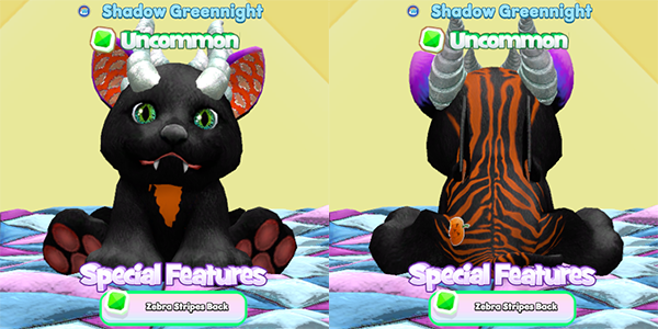 Back to Vampire Kittens! This cute baby has the standard black body, but with the orange highlights. I love the zebra stripes here and the matching inner ears. And what pet is not made 10 times more awesome with Legendary Dragon eyes and horns? I have yet to meet one!