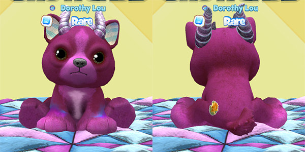 First up this week is a lil sneaky peeky of the Chihuahua pet that will be in stores very soon. This delightful magenta pup features orchid dragon horns and an orange lily pad pet patch. It also has some fun stripey glitter ears and a more subtle chest pattern. Watch for an upcoming trait breakdown for the Chihuahua!