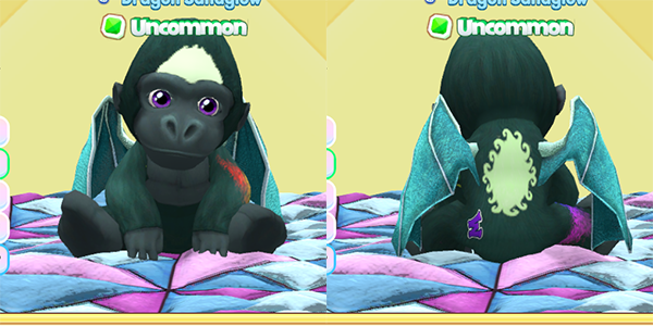 I love this winged Gorilla! The green body color is a great combination with the standard Legendary Dragon wings. There are some nice pops of color from the eyes, the W pet patch, and the rainbow borealis flair.