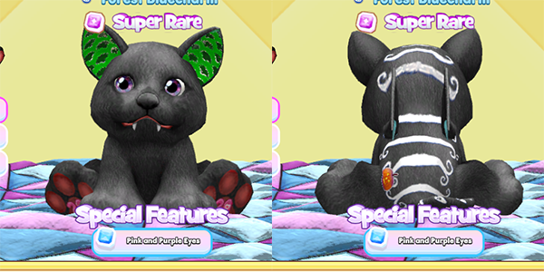 This Vampire Kitten has some very interesting traits! It got the swirl back pattern from a Twenty Year Tiger, as well as some twenty year paw flairs. The pink and purple eyes are very festive, especially combined with those green ears.