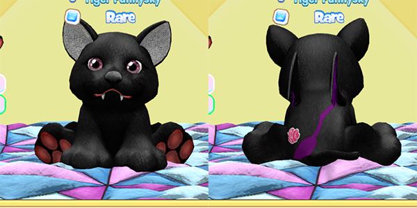 This next Vampire Kitten has a very understated look — minimal markings except for that bold broomstick on the back, and it has the cotton candy pet patch and silver ears courtesy of a Pinktastic Lion!