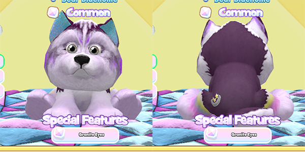 I love the look of the Husky with the Timber Wolf markings! It gives it quite the unique look. This pretty pup has the pink Husky body coloring, which goes great with the rainbow leg flair. The granite eyes are also a nice change from the default Husky, and of course I love the crescent moon pet patch!