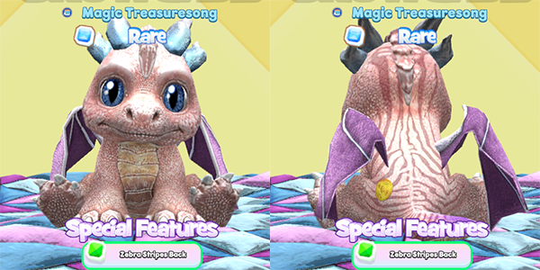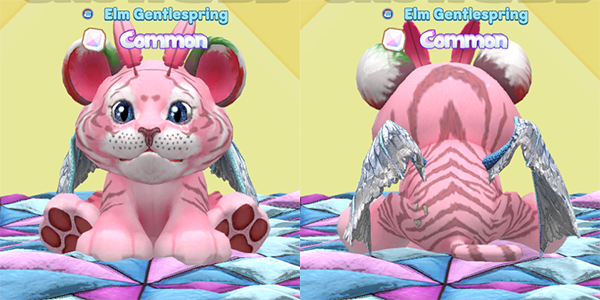 Next up is this soft blue colored Ice Dragon. It has some lovely pink wings, pastel yellow feet and horns and some interesting stripes courtesy of a Bengal Tiger! The T on the front is also from the Bengal Tiger. I wonder what they named this T-rrific pet!