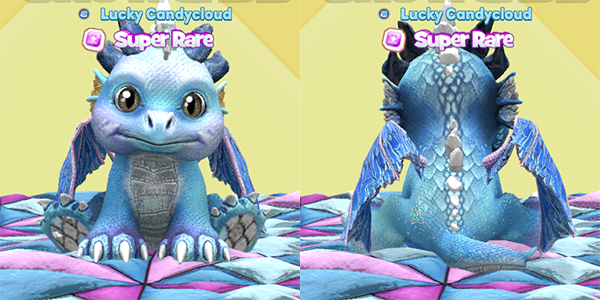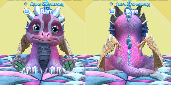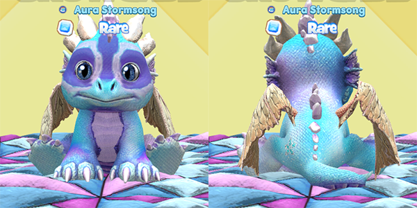For a slightly different version, Aura Stormsong also sparked a pink and blue Cotton Candy Racoon faced Ice Dragon! This one has the Cotton Candy Racoon eyes, as well, and lovely sea green paw scales. The yellow dragon wings are soft and sweet!