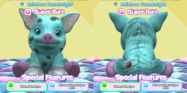 Check out this fabulous Spotted Pig! This is such a pretty teal color and it looks great with those little purple feet. The silver ears are very nice, as well — between that and the circuit breaker flair, there’s likely a Pinktastic Lion in the lineage somewhere. As always the shimmer tiger stripes look fantastic on every pet!