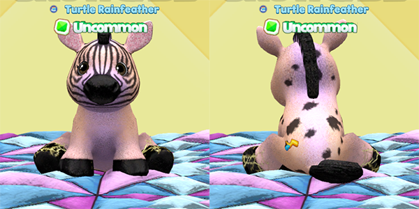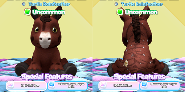 Another great pet with the shimmer tiger stripes — the Bay Horse looks great in this darker body color and those light gold eyes are lovely. It has some subtle patterning from the Spotted Pig’s leg and head patterns. So cute!
