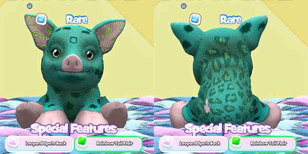 I have one of these seafoam Spotted Pigs, too! Though mine doesn’t have the White Poodle’s pet patch. I think this pet looks adorable with the leopard spots on the back and the lime pattern ears.