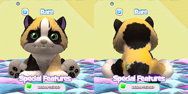 This sweet Marble Cat has the green mint eyes and holly pet patch from a Candy Cane Cat and that super sweet double eye patch face pattern. There’s a hint of purple in the ears and a bit of rainbow on the tail, but otherwise a very naturally colored pet!
