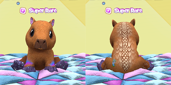 So, this Capybara is amazing. It has an Ice Dragon’s scale back pattern and scale ears, which are absolutely adorable. I love the purple sparkle paws, too. Very cute!