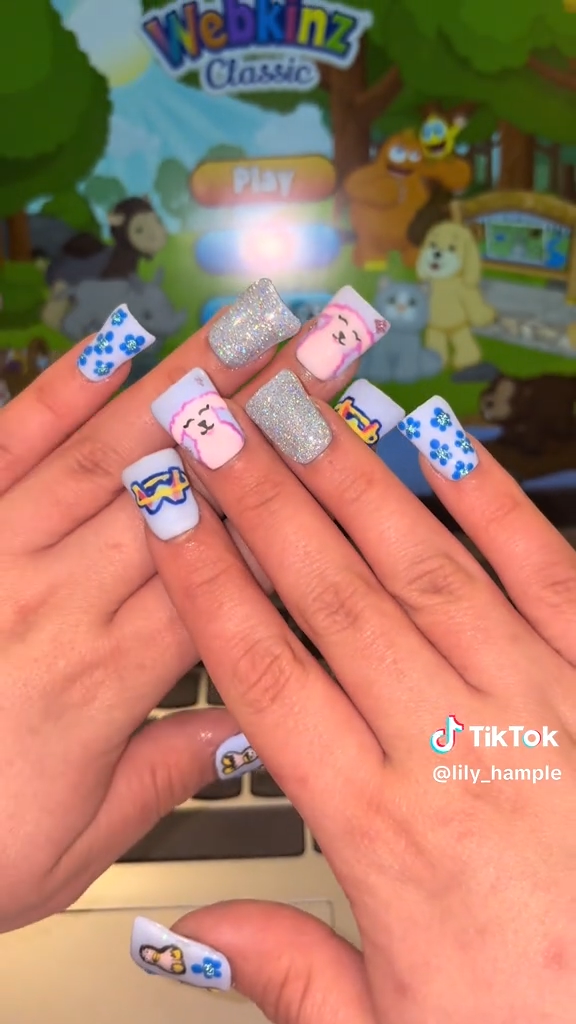Talented creator @lilyhamplemakeup_ (also known as @lily_hample on Instagram) shared these amazing Webkinz-inspired nail designs. Each nail captures the playful colors and cozy charm of Webkinz in a unique way.