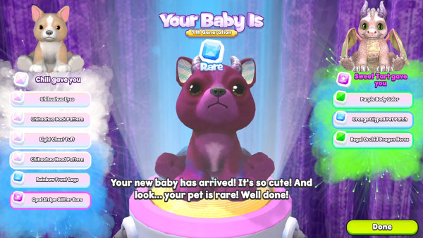 Sparking is so fun! I do wonder however if the random factor would ever be replaced with some sort of character creation option in the future for a little more control over how your pet looks. I’m a free Next player, so it takes me months to build up enough diamonds to spark a baby and it can be pretty frustrating if it doesn’t have the traits I was hoping or I get a redemption pet. It’s still exciting as it is, just some suggestions for future possibilities :D