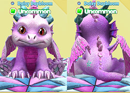 This baby is absolutely striking, and I love how it’s melding two very different vibes. On one hand, the golden horns overtop their bright, unmarked face is so chic. On the other hand, the striped back pattern, denim-blue wings and sparkle hooves are an absolute party! Put everything and you’ve got one gorgeous Ice Dragon!
