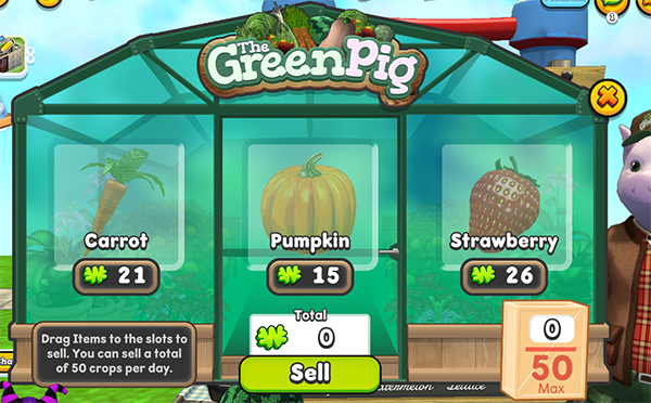 The Green Pig is where Farmer Will loves to buy fresh produce—but he’s picky about what he’ll take! If you have the items he’s looking for, he’ll pay much more than the W Shop. You can sell up to 50 of the featured foods each market day.