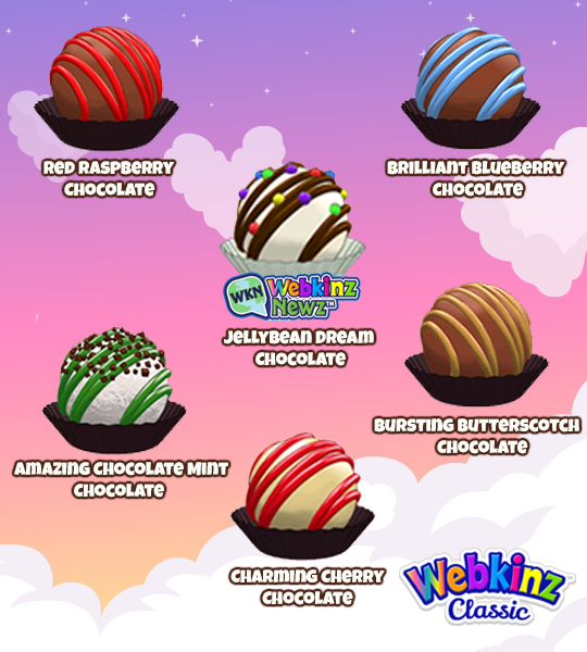 There are six chocolates to collect. Five can be collected from Cinnamon’s Chocolate Stand, but one is only available right here, on Webkinz Newz. From February 7 – 14, look for the floating Jellybean Dream Chocolate on Webkinz Newz and click on it to send it back to your Webkinz Classic account.