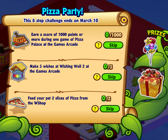 There are three tasks you’ll need to complete to finish each step of this challenge: Earn a specific amount of points during one game of Pizza Palace, make 5 wishes at Wishing Well 2, and feed your pet 2 slices of Pizza from the WShop:
