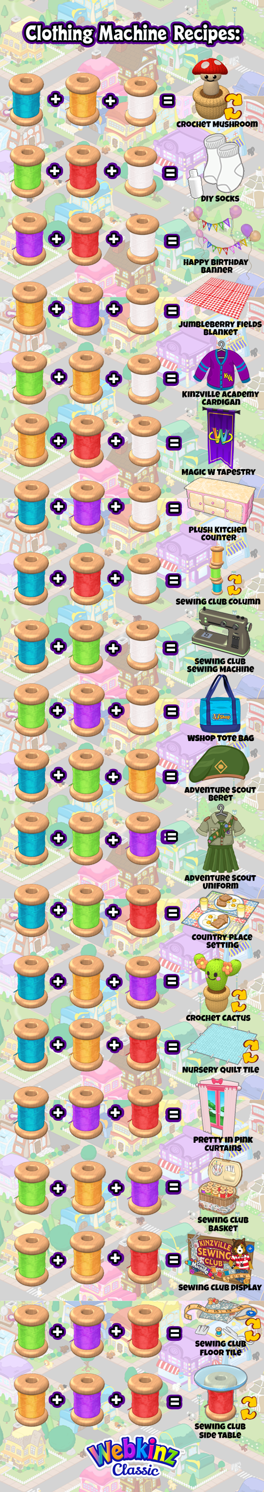 Combine any three unique spools of thread on the Clothing Machine to make Kinzville Sewing Club prizes for your pets!