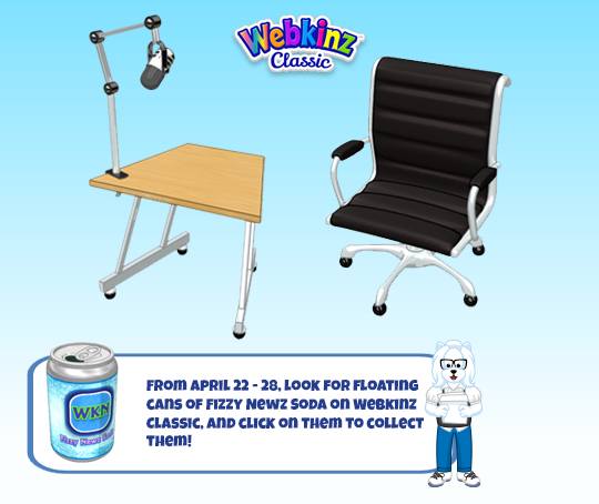 From Wednesday, April 22, to Tuesday, April 28, look for floating cans of Fizzy Newz Soda on Webkinz Classic, and click on them to collect them (limited to 2 a day of free and full players, and 3 a day for Deluxe players).