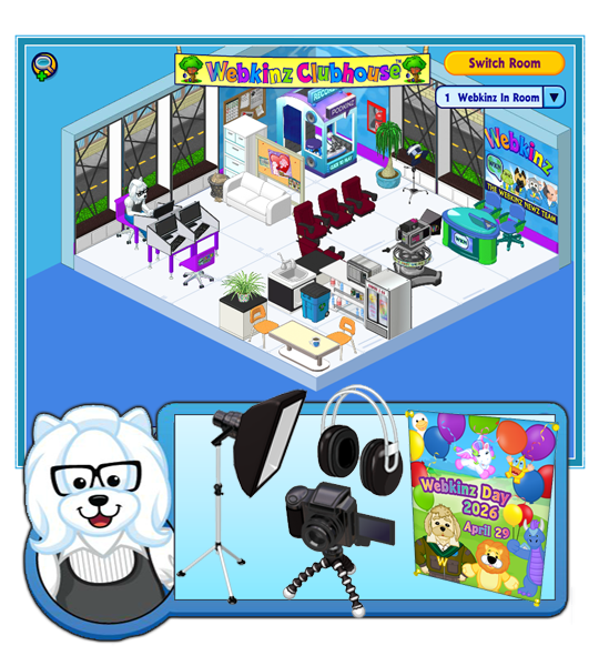 When you enter the room, you’ll see Ella blogging away at her desk, and you can click on her once a day to collect a gift! This year there are four different gifts to collect: A Newz Vlogger Light, Headphones, Camera, and a Webkinz Day 2026 Poster: