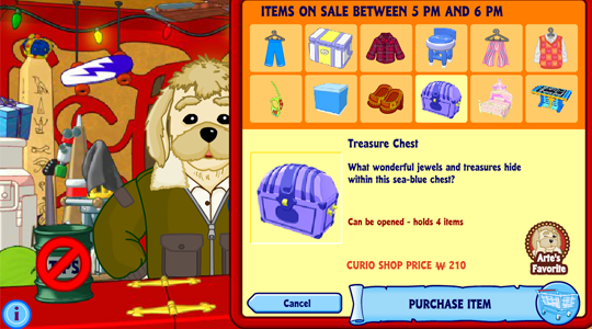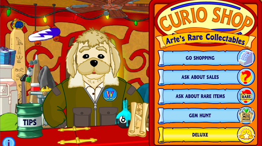 Access the Curio Shop from the Things To Do menu and click the Go Shopping button. Click on each item and look for ones that feature the “Arte’s Favorite” icon. Arte changes his stock every hour so check back often!
