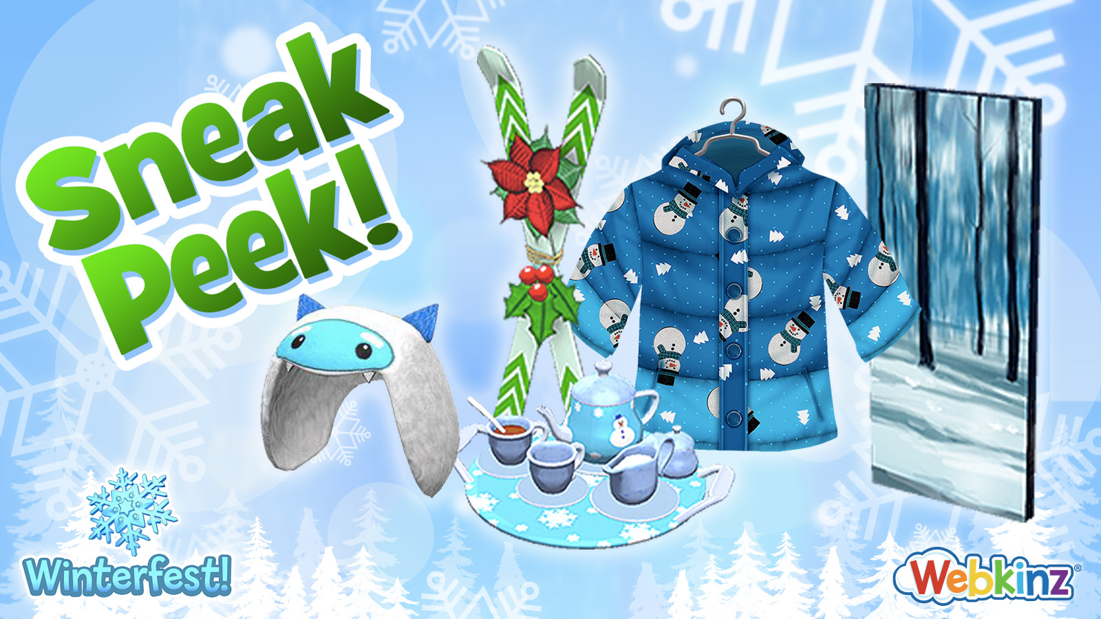 Every time you catch a snowflake, you earn a prize! There are five cool new prizes to collect: Artisan Skis; a Winterfest Wall Panel; a Winterfest Tea Set; a Yuletide Yeti Toque; and a Fun in the Snow Jacket!