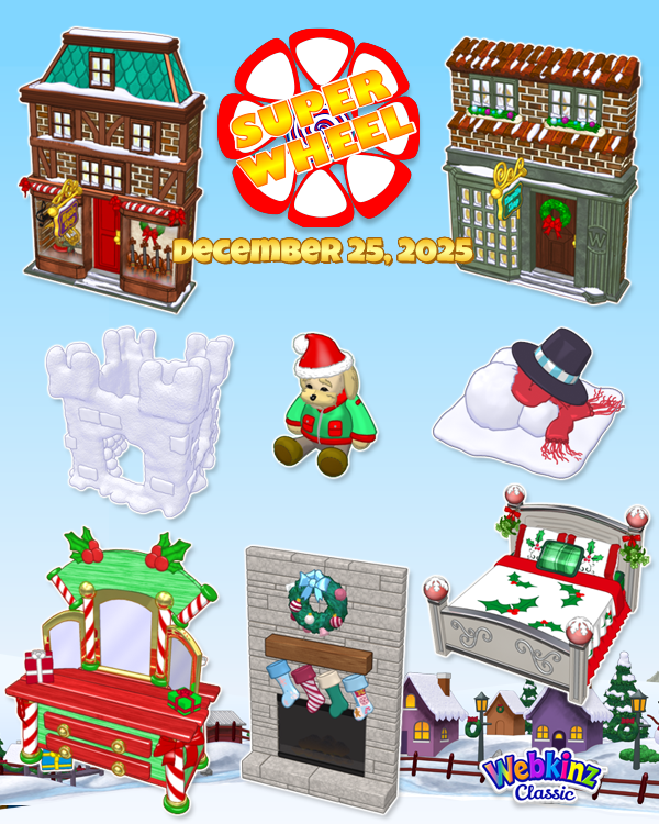 You can spin the Super Wheel by visiting the Today’s Activities schedule on Webkinz Classic, but it will only be available on Thursday, December 25th… so don’t forget!
