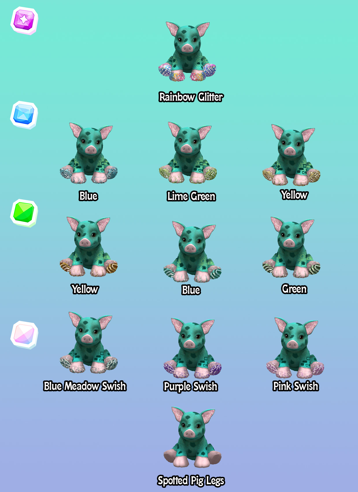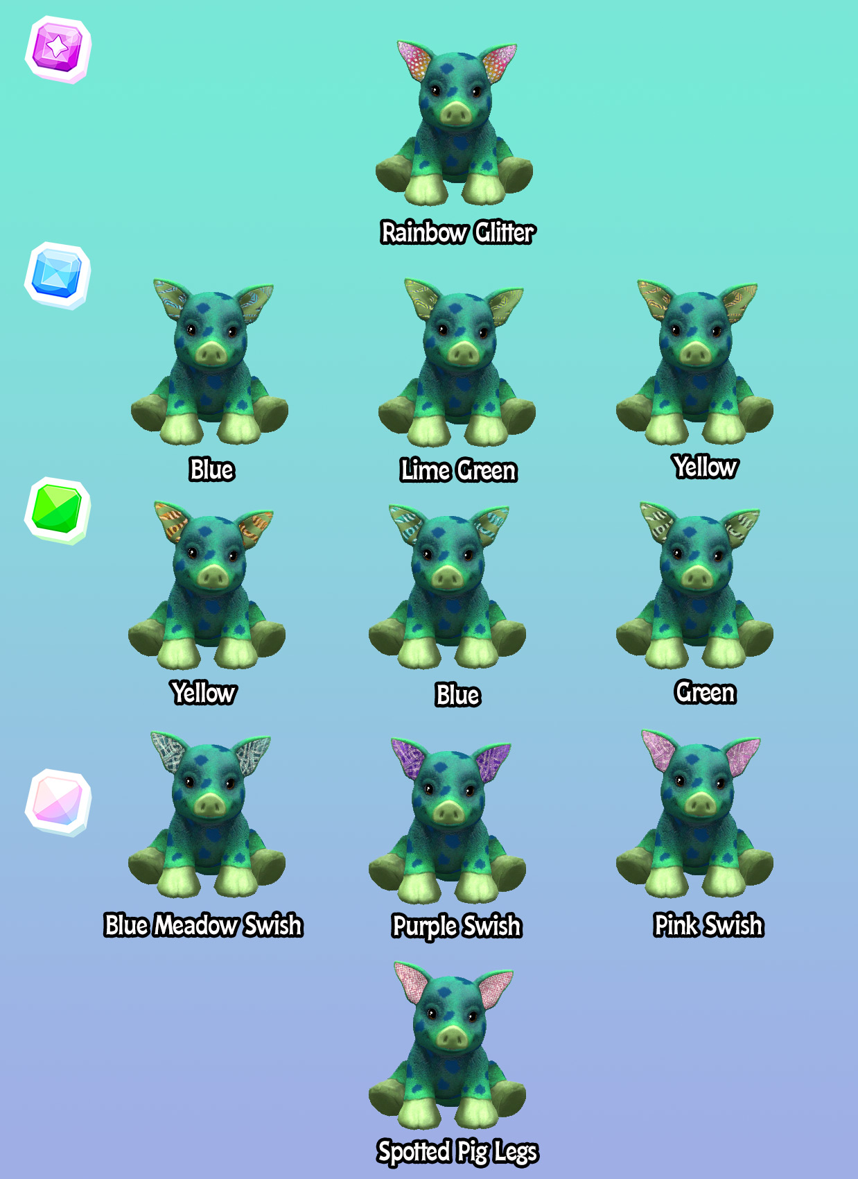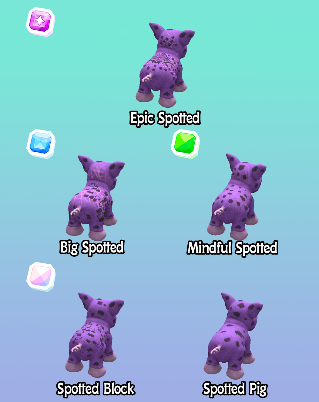 Oh, these traits are so cute. Sadly, my spotted pig didn’t spark any spotted pigs, so I won’t be able to try for any of these traits. The pet patches are funny. I also like all the colors.