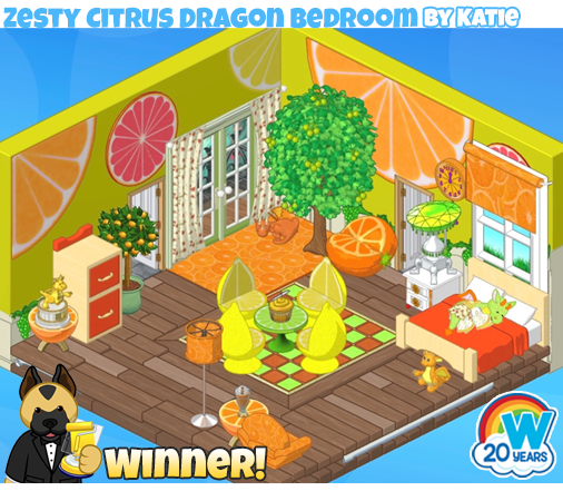 “I love the vibrant colors that are carried throughout this room. You can tell that a lot of thought has been put into each item here, and their placement. The Zesty Citrus Dragon looks so peaceful sleeping, and I’m sure it finds comfort having Cinder, the baby dragon plushy, sitting at the foot of the bed. Everything seems so natural here, even the tree that is featured in the back corner of the room. It’s not often you see trees being used in indoor designs, but for some reason, it looks like it belongs here. And I love that bean bag chair resting right next to it. What a cozy place to read your favorite fairy tale! Well done Katie! Your room is wonderful!”